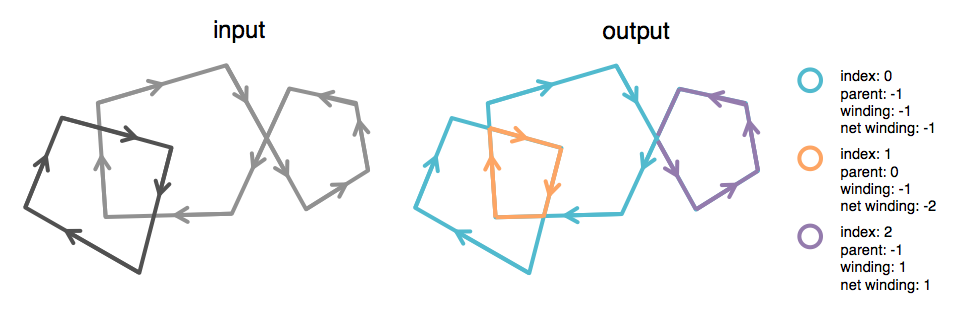 In the above example, the output will be a FeatureCollection of two polygons, one with coordinates [[[0,0], [2,0], [1,1], [0,0]]], parent -1, winding 1 and net winding 1, and one with coordinates [[[1,1], [0,2], [2,2], [1,1]]], parent -1, winding -1 and net winding -1.