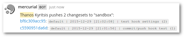 Mercurial server-side hooks for Mattermost messaging service. Multiple repositories with shared project branches support.