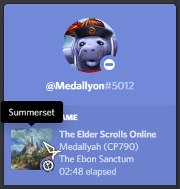 This little program is made using the .Net 4.6.1 framework and sends Rich Presence data to your local Discord client, making your status say more than just "Playing Elder Scrolls Online", including info about your current location, your level, your current party, and more! While running, your presence should look like this: