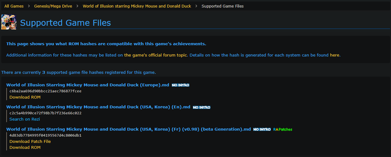 - Refresh any RetroAchievements.org “Supported Game Files” page.