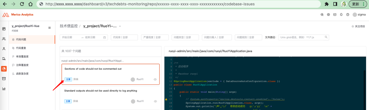 导航: 左侧菜单栏 技术债监控 - 代码问题。