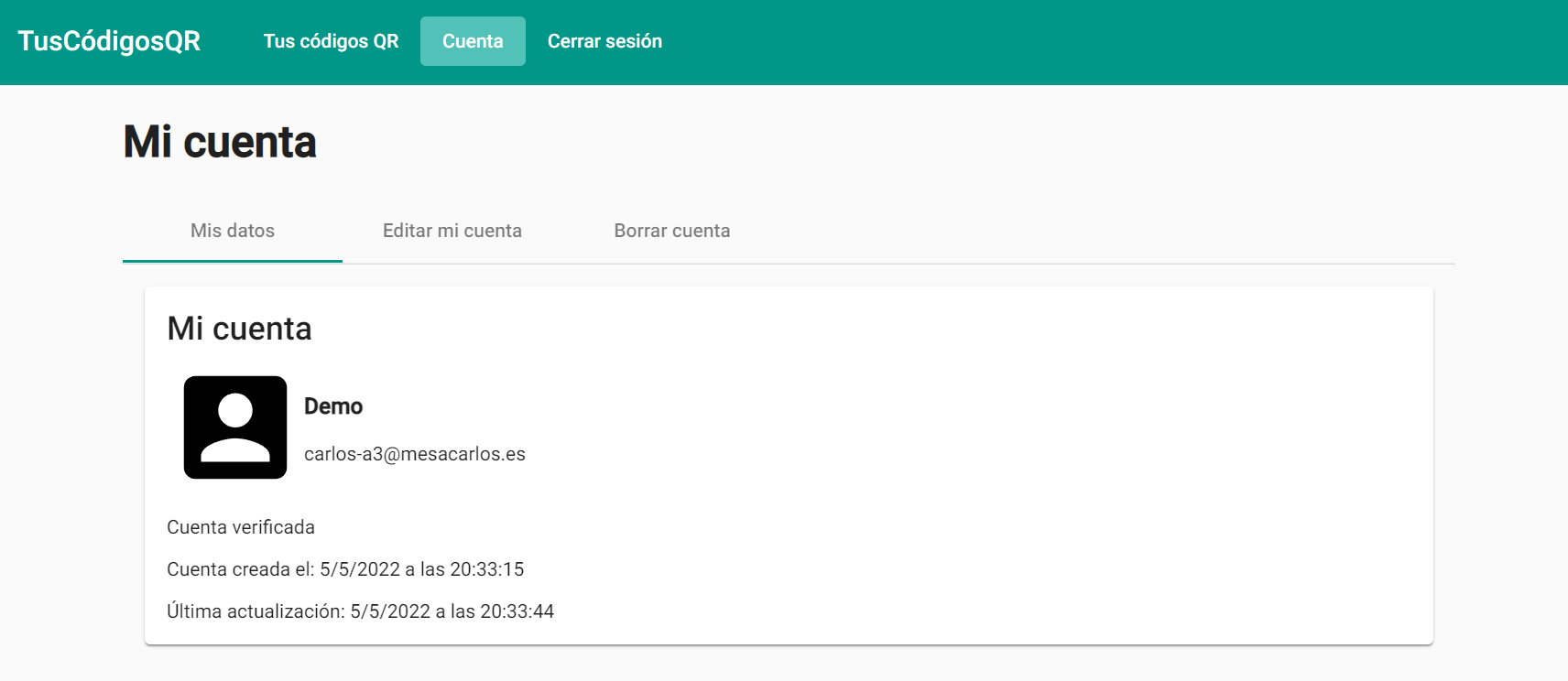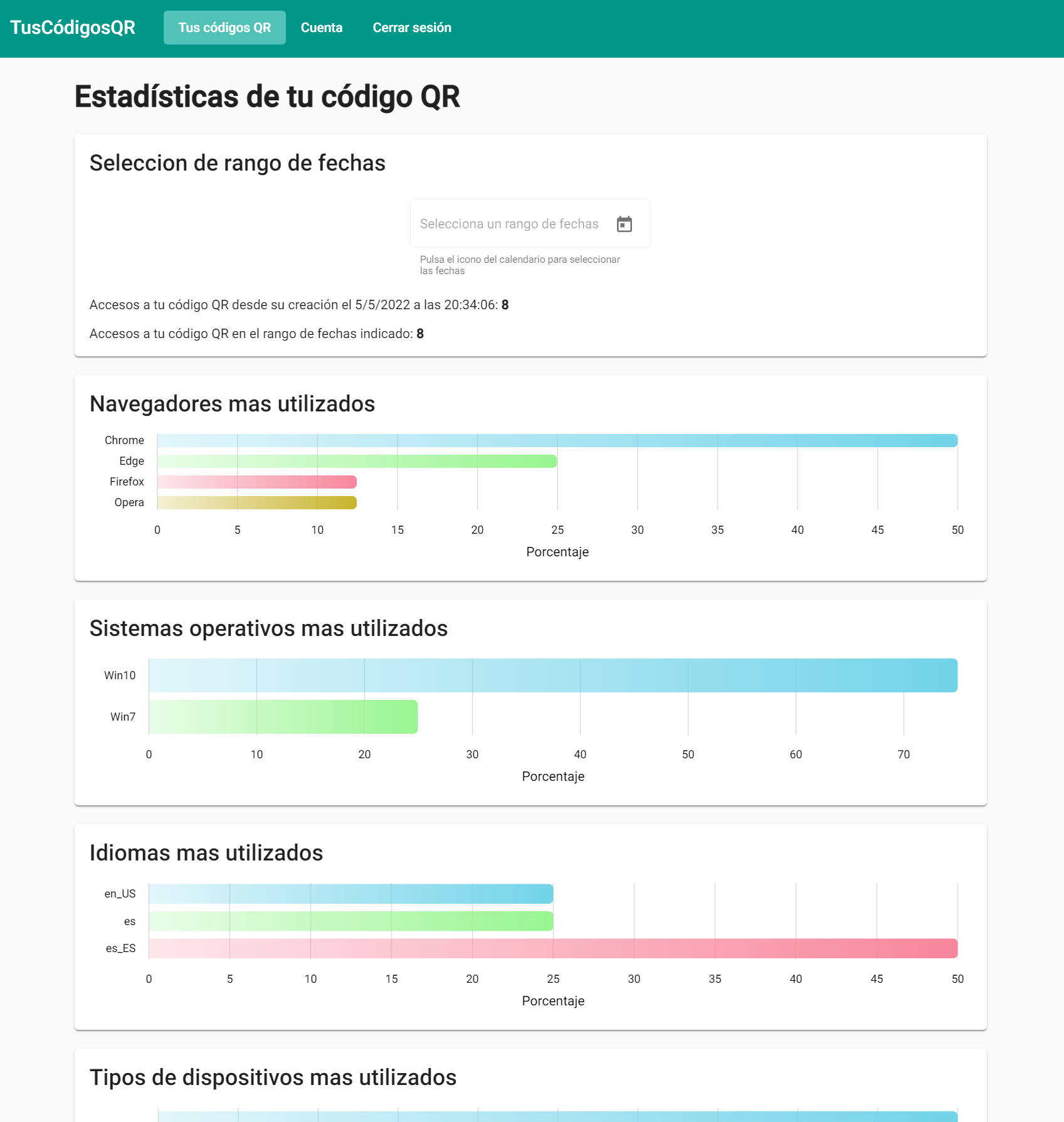 La aplicación permitirá a los usuarios del sistema registrar una nueva cuenta en el sitio web y, una vez iniciado en sesión, el usuario podrá crear códigos QR, así como direcciones web acortadas cuyo destino sea una tercera dirección web a elección del usuario. Una vez creado, el usuario podrá modificar el destino del código QR sin ser necesaria la modificación de la imagen de código QR. Además, la aplicación mostrará información al usuario como el número de accesos, el dispositivo utilizado para acceder al QR, el idioma y el sistema operativo, entre otros. Además, se permitirá personalizar la imagen generada del código QR incluyendo elementos como un logotipo a elección del usuario, el estilo, el tamaño y los colores.