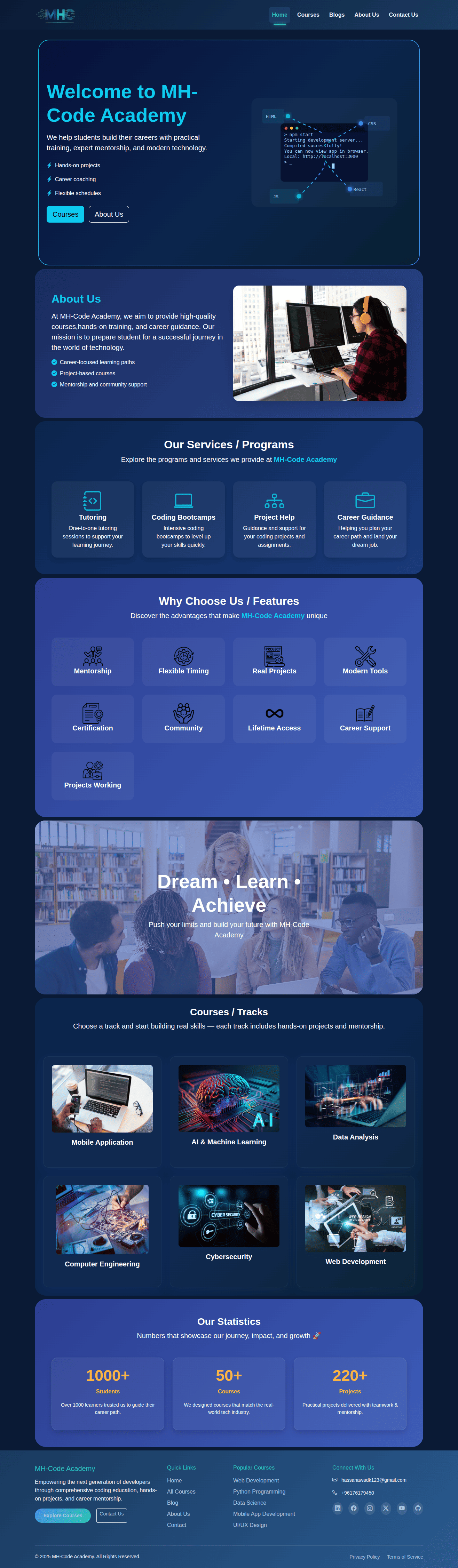 The home page introduces the user to MHCode Academy and includes: