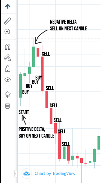 timeframe the script will now determine if the current candle being created is on that specific timeframe is bearish or bullish . Whenever there is a bearish candle it will sell and whenever a candle is bullish it will buy. The position will be held until stop-loss or takep-rofit values are hit or if there is a new candle. The script will continue performing this procedure infinitely.