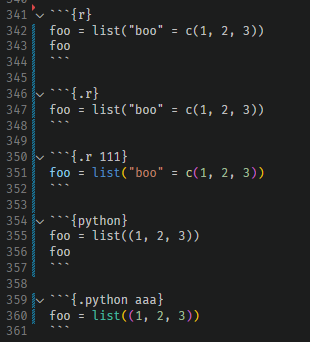 In RStudio, code block marked with '```\{r.+?\}' can be recognized as runable block, but in vscode grammer, only '```\{\.r' can be recognized as R format. (This feature was first added to support Codebraid format at