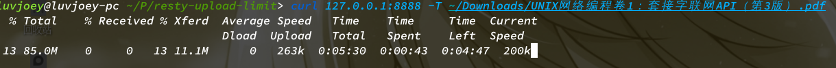 foo@bar> openresty -p `pwd` -c nginx.conffoo@bar> curl 127.0.0.1:8888 -T {some file}-- iter req body, limit upload speed in 200kb/s