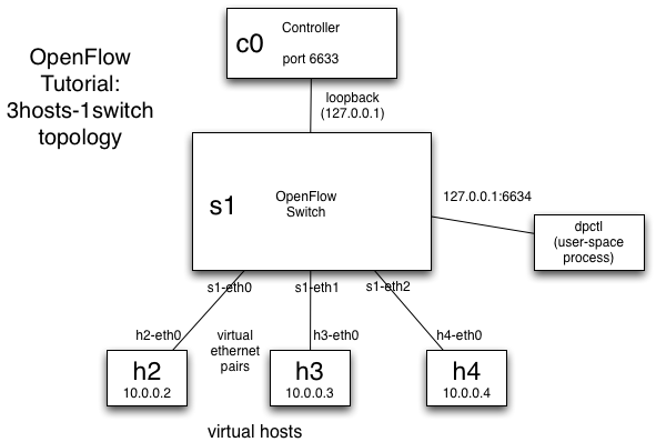 The network you'll use for the first exercise includes 3 hosts and a switch (and, eventually, an OpenFlow controller, but we'll get to that later):