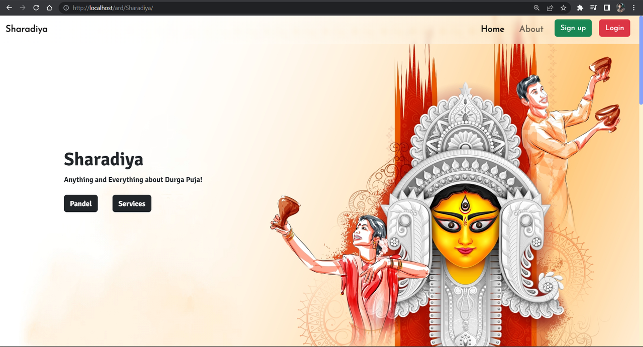 Sharadiya is a wholesome website for festive season currently it is on Durga Puja mainly designed for specially abled people who are unable to come to pandels, it is designed for them to get the full experience of the festive season. Also to the people who are unable to come to their hometown for festive season, Sharadiya is designed for them <3