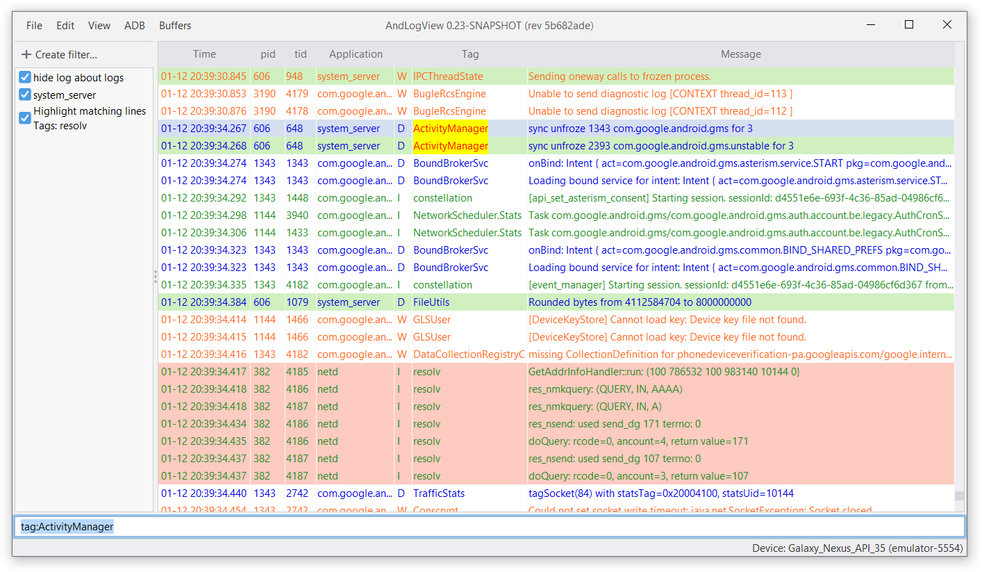 AndLogViewer is the tool to simplify analysis of the Android logs, both online and offline.