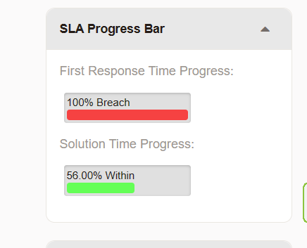 a) When ticket is within SLA / Escalation, green bar (applicable to open and closed ticket) b) When ticket is within SLA / Escalation and reached 'notify before' time (if configured), yellow bar (applicable to open ticket only) c) When ticket is overdue SLA / Escalation , red bar (applicable to open and closed ticket)