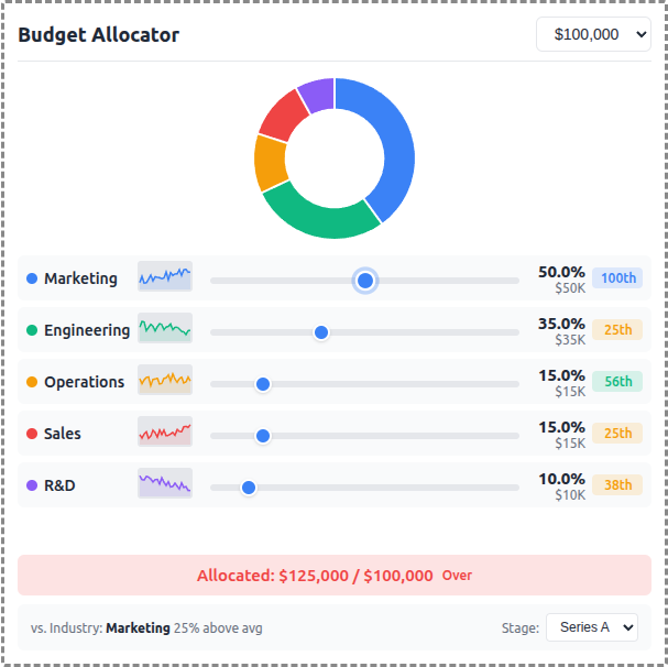 - **Interactive Sliders**: Adjust budget allocation across 5 categories (Marketing, Engineering, Operations, Sales, R&D)