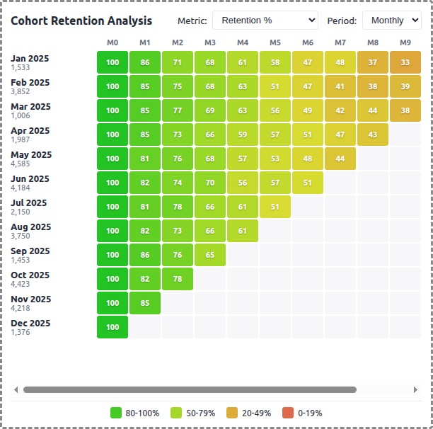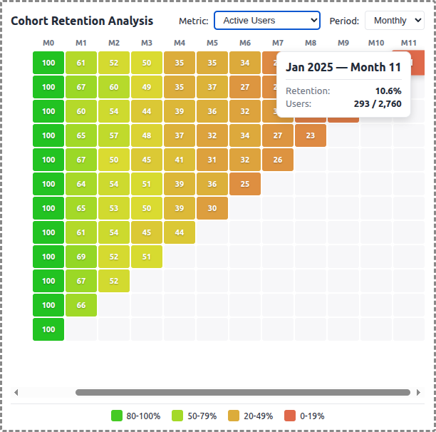 - **Cohort Retention Heatmap**: Color-coded grid showing retention percentages across cohorts and time periods
