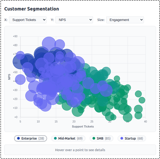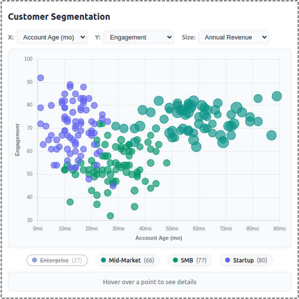 A demo MCP App that displays customer data as an interactive scatter/bubble chart with segment-based clustering. Users can explore different metrics, filter by segment, and click to see detailed customer information.