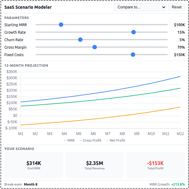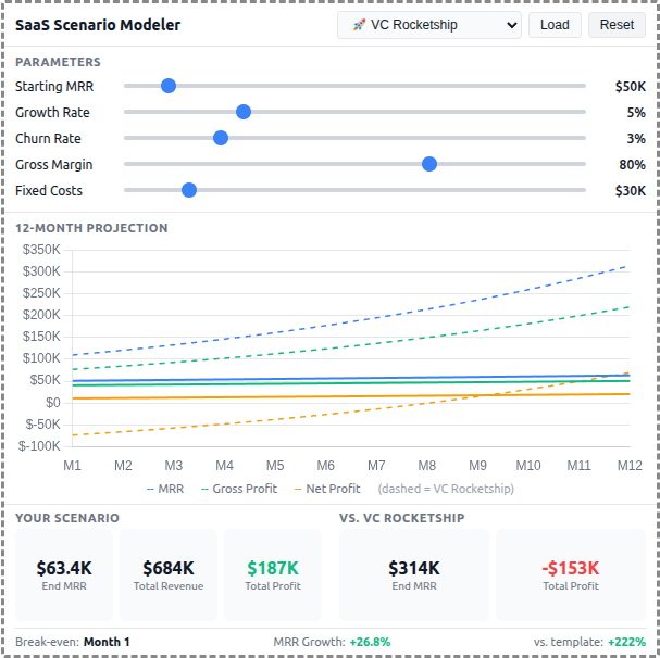 - **Interactive Parameters**: 5 sliders for Starting MRR, Growth Rate, Churn Rate, Gross Margin, and Fixed Costs