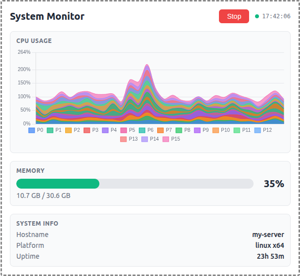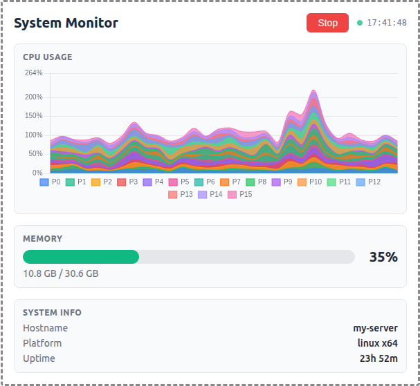 A demo MCP App that displays real-time OS metrics with a stacked area chart for per-core CPU usage and a bar gauge for memory.