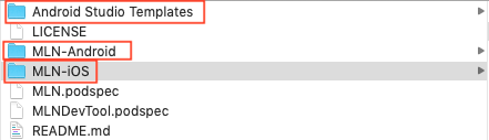 No. directory Function description 1. Android Studio Templates AS template(Several types of bridges) 2. MLN-Android Android sdk source code + demo project(Meilishuo demo, other demos) 3. MLN-iOS iOS sdk source code + demo project(Meilishuo demo, other demos)