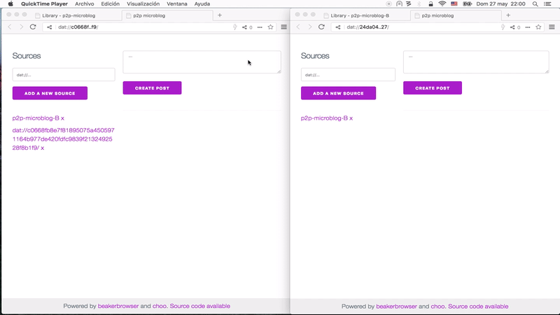 posts.jsonfile. - Every user can subscribe to other user adding the dat url to the