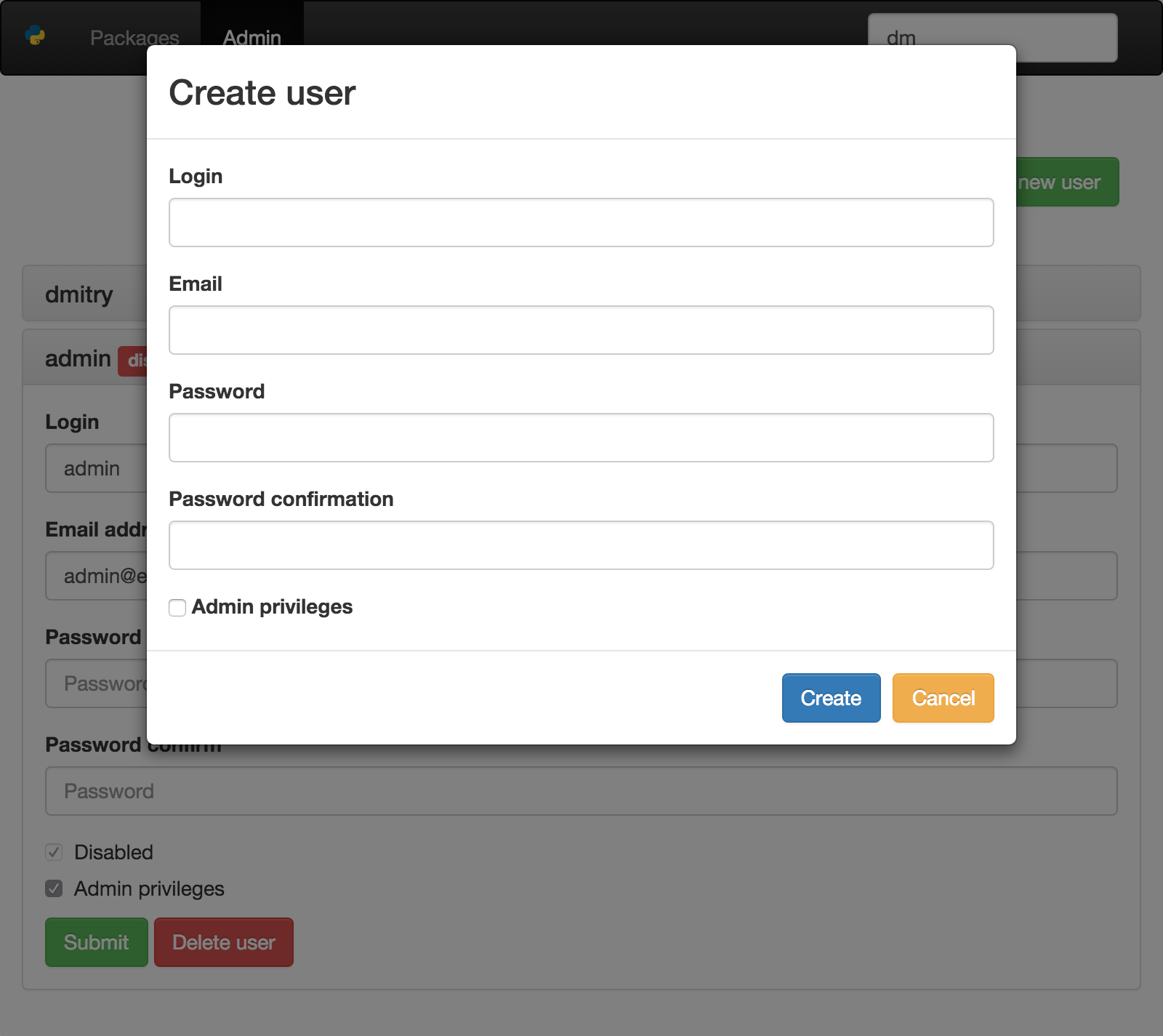 pip install 'pypi-server[postgres]' # or 'pypi-server[mysql]'Default admin login password is: admin admin