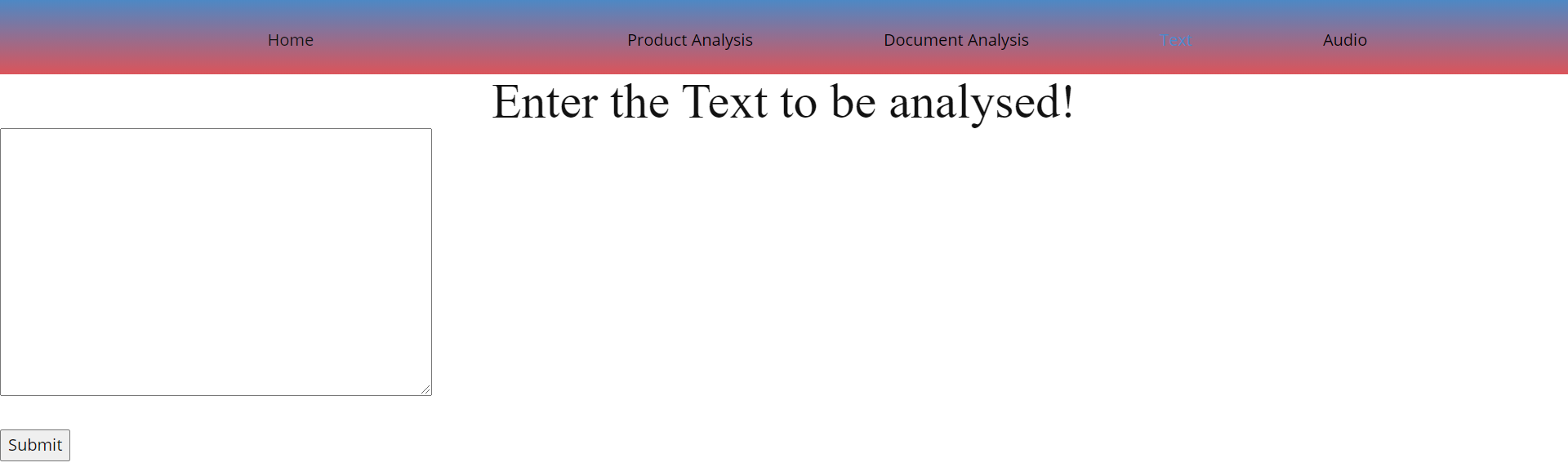 localhost:8000in the search bar to open the webUI of the application. - The UI typically looks as shown below and here you have a choice between URL, file or normal text input.
