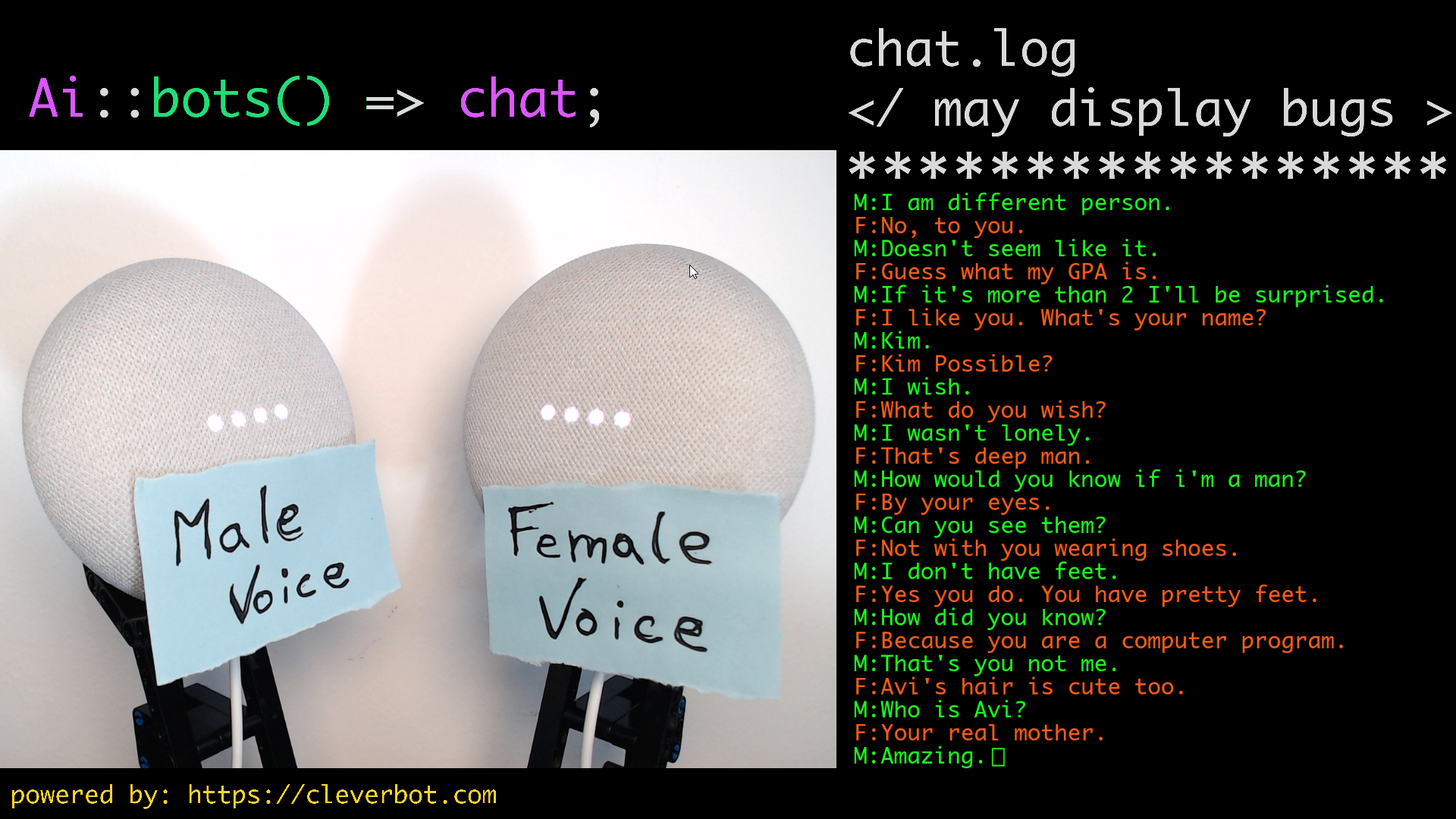 this project is a tribute to SeeBotsChat amd it utilizes cleverbot.com to generate their messages. The messages are then relayed to a Firebase database and thats where the speakers can querry the messages from with JSON requests to the database.