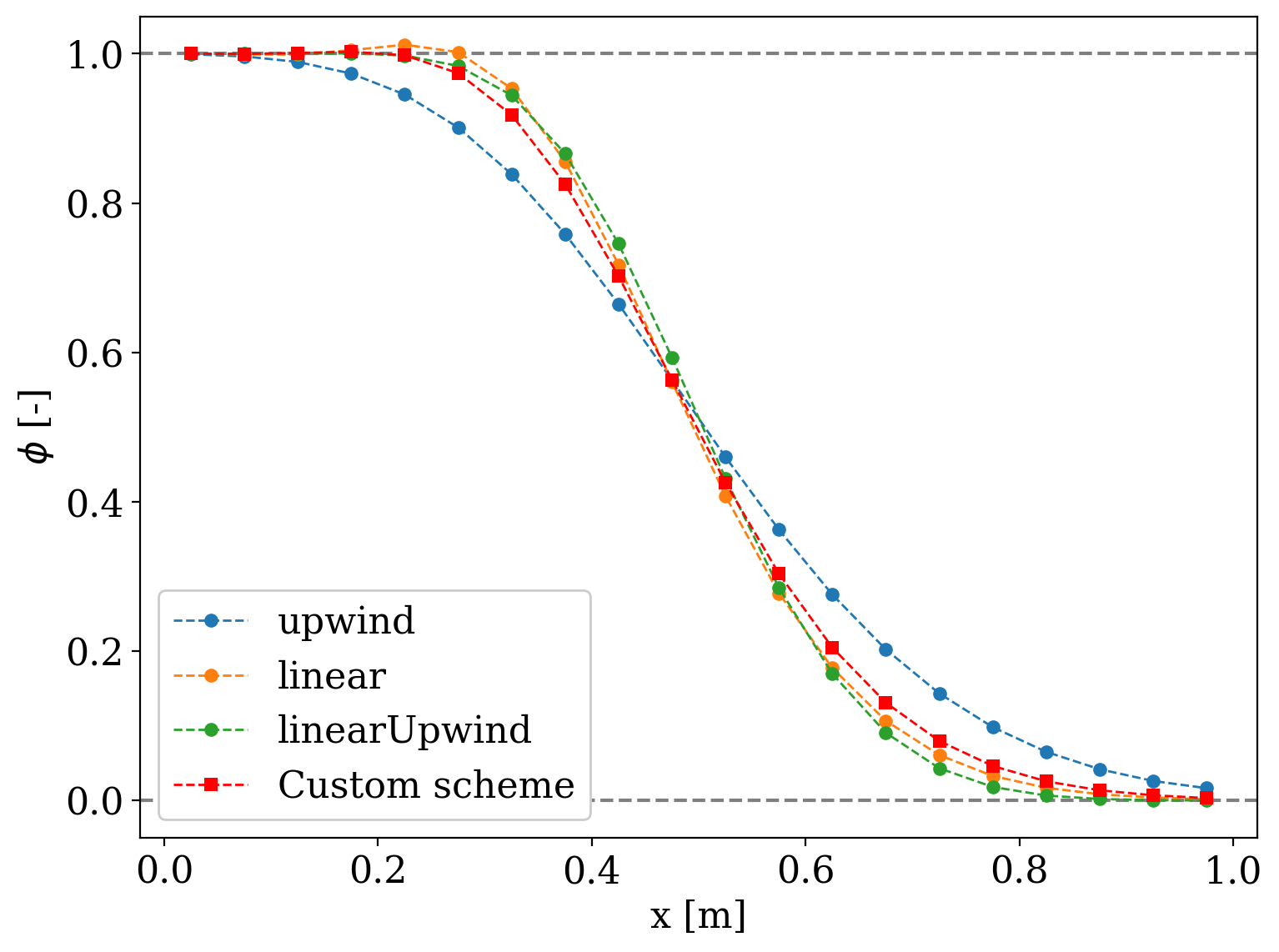 Test case used is a simple 1D flow with a dimensionless scalar field convecting a jump in the x-direction. Observe how the blended scheme is more accurate than pure upwind but avoids overshoot of the simple linear scheme.