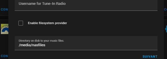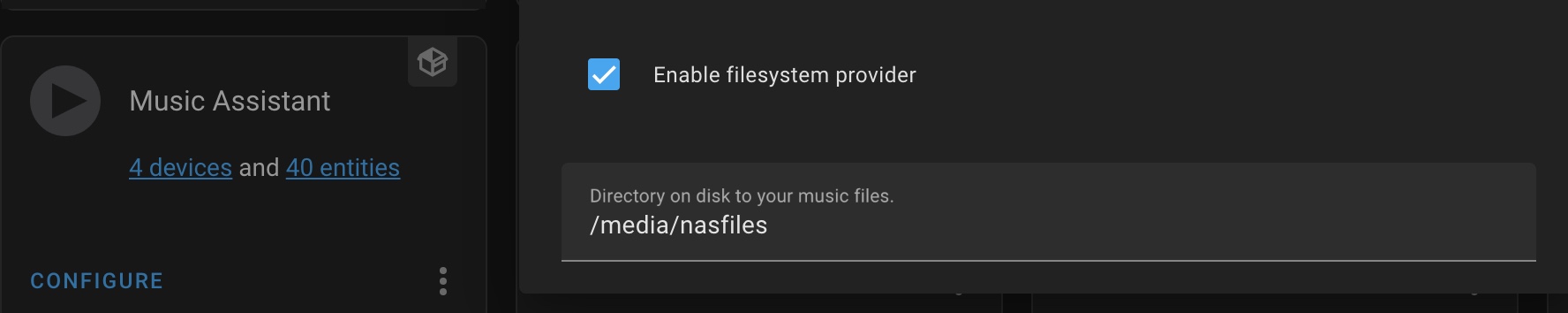@No-Idea-76 To verify, your next steps in order are: Copy/paste here your mount command that lives in configuration.yaml - note you must use the tp-share's ip address and not the name tp-share in the mount command and you have to use / and not \ . Assuming your tp-share router has an ip address 192.168.1.1 your mount command should look like this (replace your username/password and correct ip address of course): Note!!! There is a space between Next, copy/paste here your automation that lives in automations.yaml. Assuming you used my exact example above, it will look like this: Next, please verify you have this command in configuration.yaml as this tells HA to use the above automation Next, after restarting your HA you should be able to browse the tp-share/g/music directory from within Home Assistant using "Media" from the left column of Home Assistant. Chose Local media first, then you should see your Music share - this is what mine looks like. What do you see? Finally, if you can see your music under Media then it will work in Music Assistant by enabling filesystem provider in the MA integration configuration as follows: |