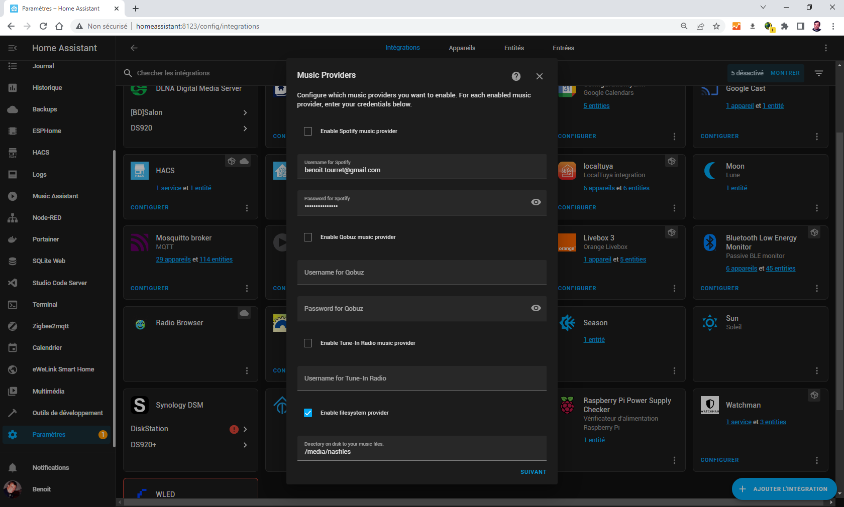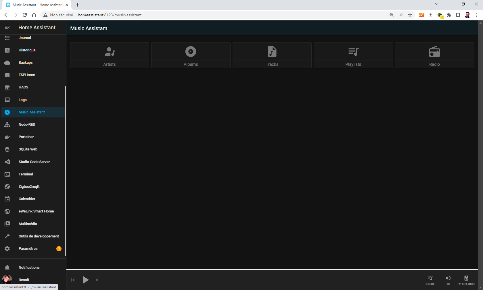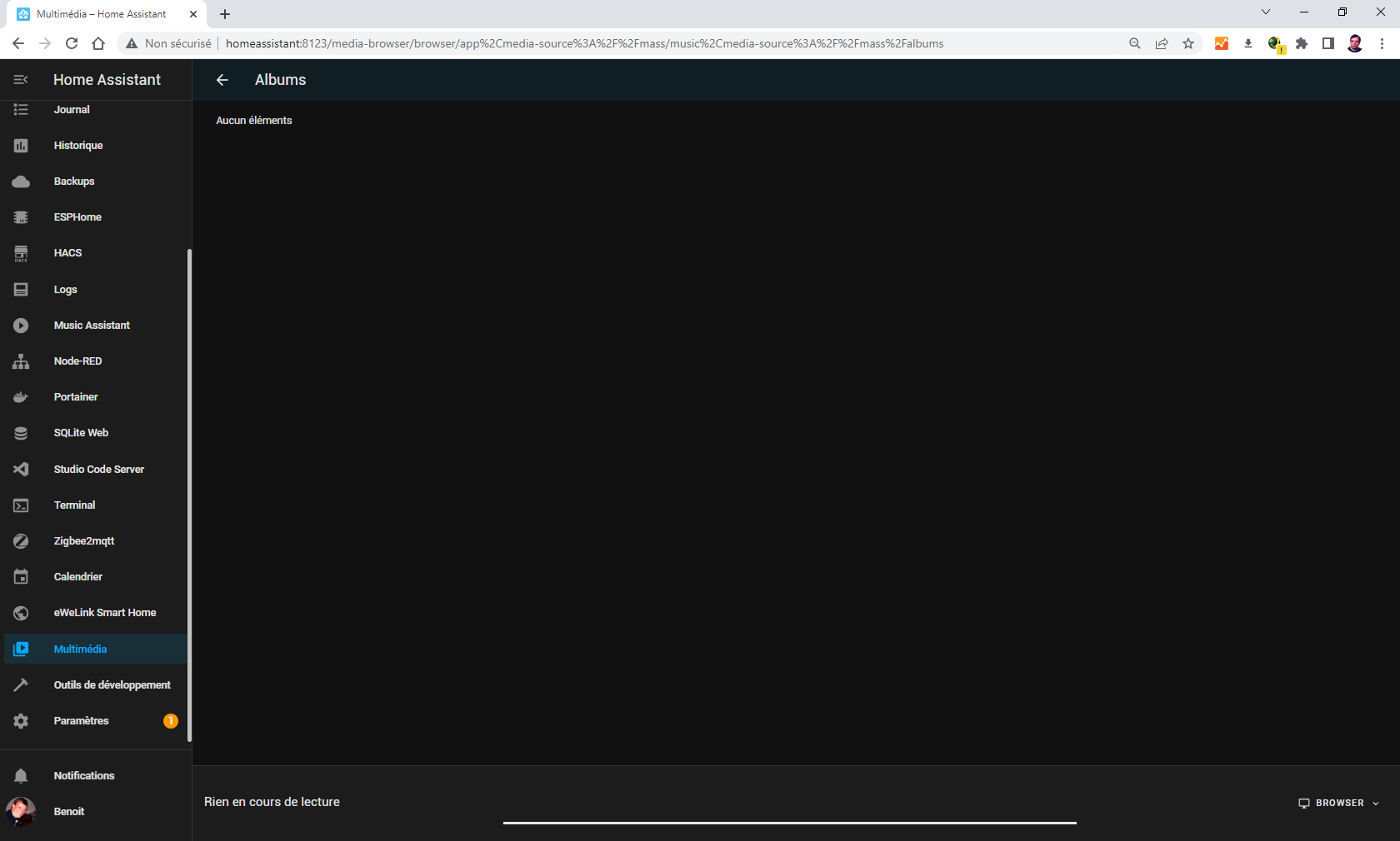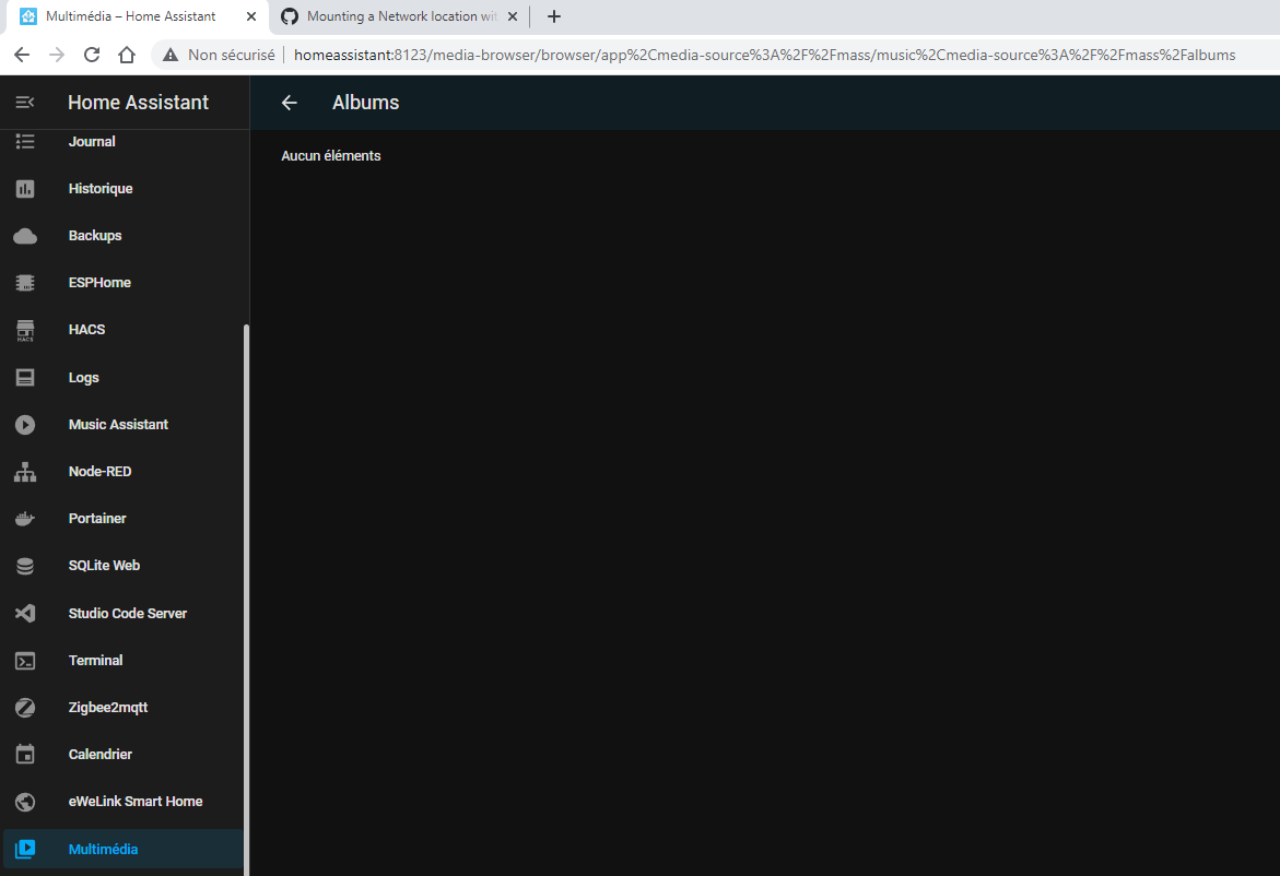 Hello, when I go in music assistant as follow: left pannel : multimedia / music assistant I ran out of idea.... Help !!! Here is my configuration: System Health