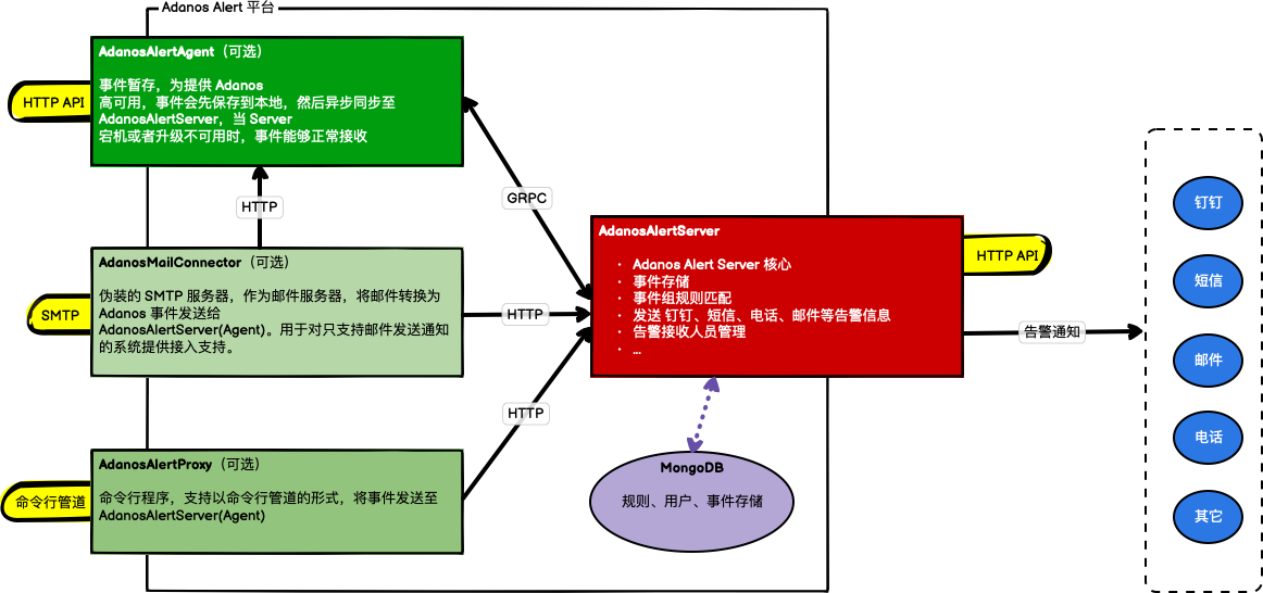 - Implement alarm event reception and dispatching separation through adanos-alert-agent for high availability of event alarm notifications.