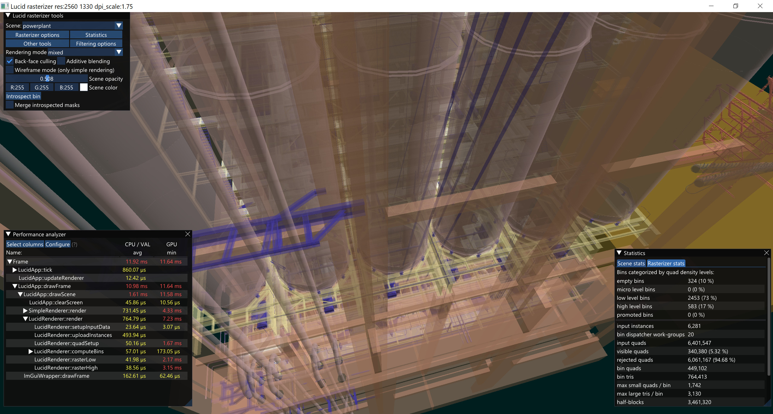 LucidRaster is a software rasterizer running on a GPU which allows for efficient exact rendering of complex transparent scenes. It uses a new two-stage sorting technique and sample accumulation method. On average it's faster than high-quality OIT approximations and only about 3x slower than hardware alpha blending. It can be very efficient especially when rendering scenes with high triangle density or high depth complexity.
