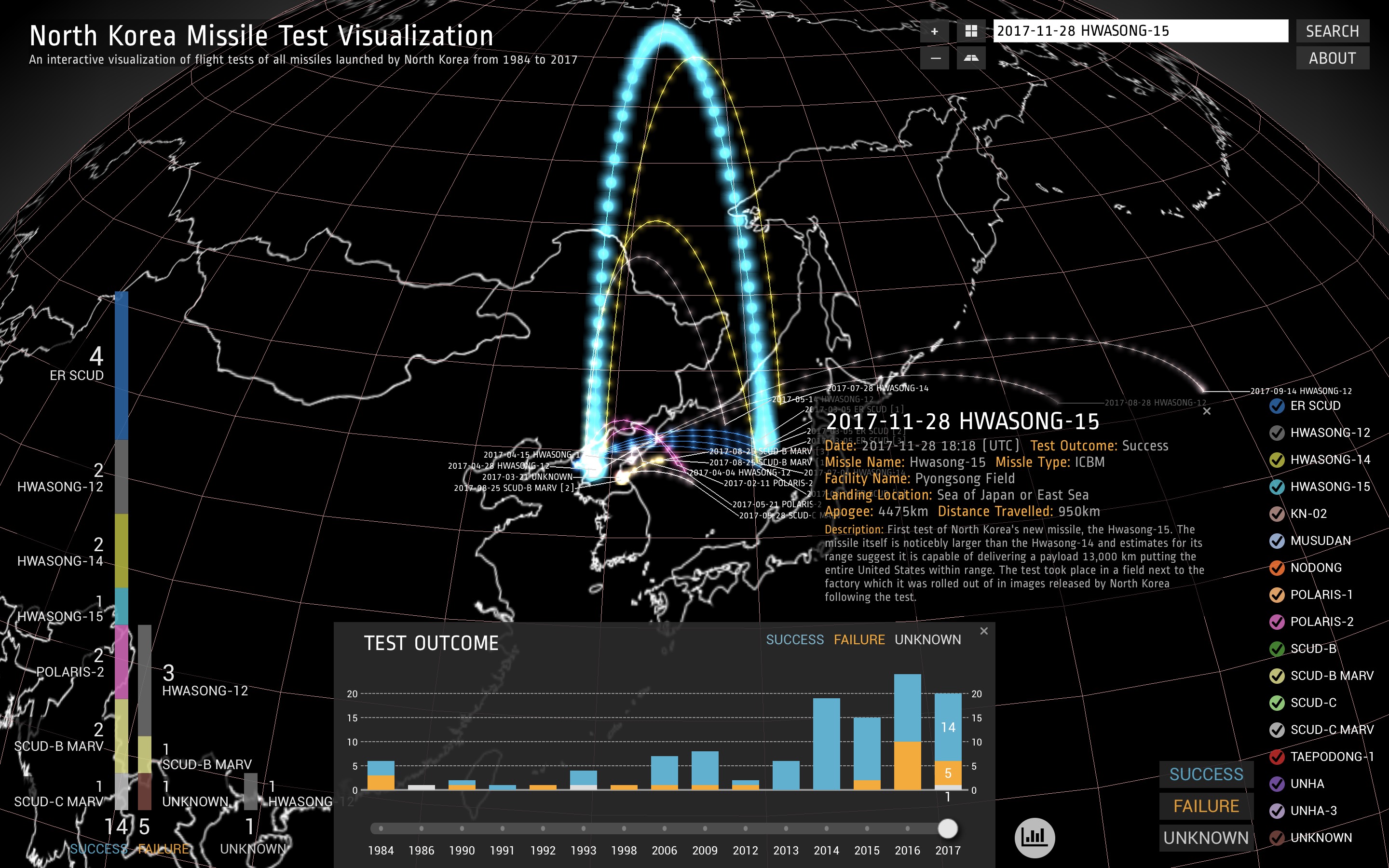 The data for this visualization are sourced from the CNS North Korea Missile Test Database, which is the first database to record flight tests of all missiles launched by North Korea capable of delivering a payload of at least 500 kilograms (1102.31 pounds) a distance of at least 300 kilometers (186.4 miles). The database captures advancements in North Korea's missile program by documenting all such tests since the first one occurred in April 1984, and will be routinely updated as events warrant.