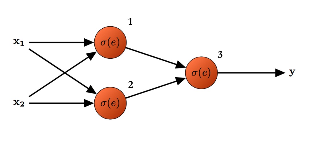 最后,使用权重$w_13$和$w_23$和sigmoid函数来计算最终的输出$y$。