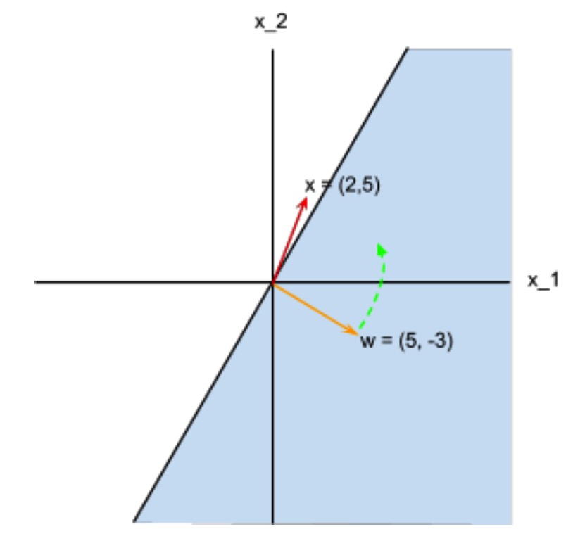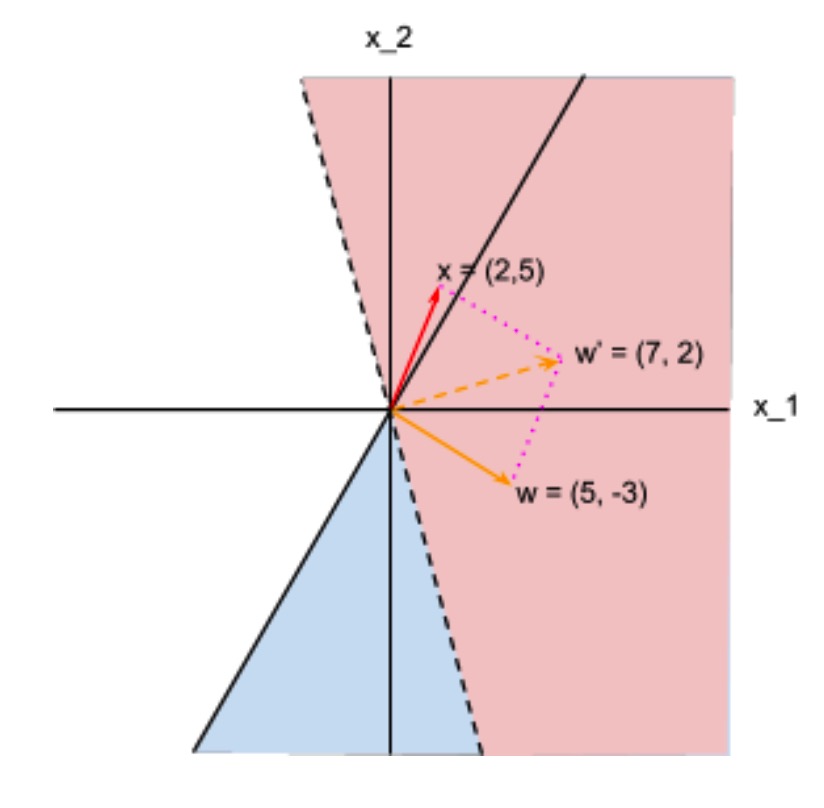 完美!这次我们的权重向量能让感知机正确的把$x=(2, 5)$这个点分类了。因此,主要的问题是,我们能不能推导出一个更一般化的规则来涵盖上面的步骤?一种可能的规则是$$w' = w+x.$$