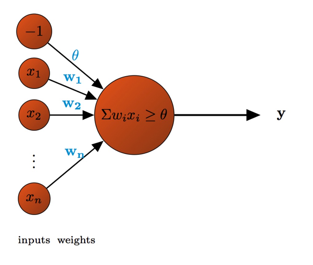 在上图中,$\theta$是触发阈值,$w_i$是权重,$x_i$是输入,$y_i$是(离散的)输出。一般来说,神经网络是可以有连续输出的,但是在本文档中我们只讨论离散输出。感知机根据如下的数学公式计算输出:$$\hat y = \chi (\sum^n _{i=1} w_i x_i - \theta) = \chi (w\cdot x - \theta).$$