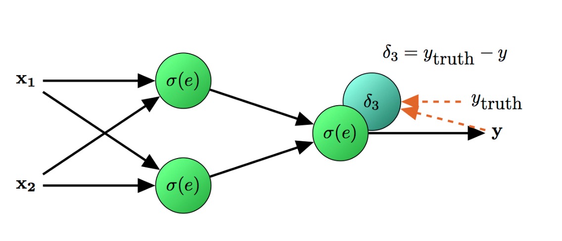 有了输出$y$,我们就可以计算真实的值$y_{truth}$和$y$直接的误差$\delta_3$。这是误差反向传播的开始。