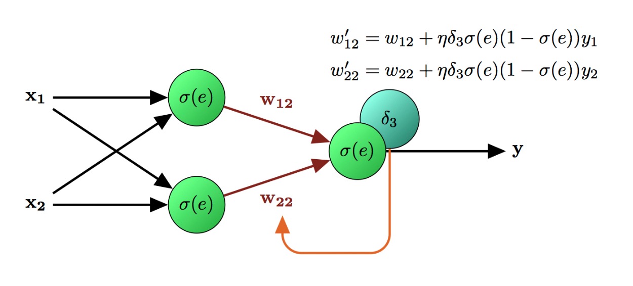 相似的,我们可以计算更新后的权重$w'{(x1)2}$和$w'{(x2)2}$。和上一个图中相似,下面的方程中,$e = w_{(x1)2} \cdot x_1 + w_{(x2)2} \cdot x_2$。