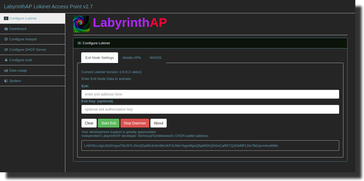 LabyrinthAP interfaces with Lokinet daemon to facilitate connections to the Lokinet global privacy network. LabyrinthAP provides a simple, responsive web interface to control wifi, hostapd, Lokinet daemon and related services necessary to access Lokinet on the Raspberry Pi or Orange Pi.