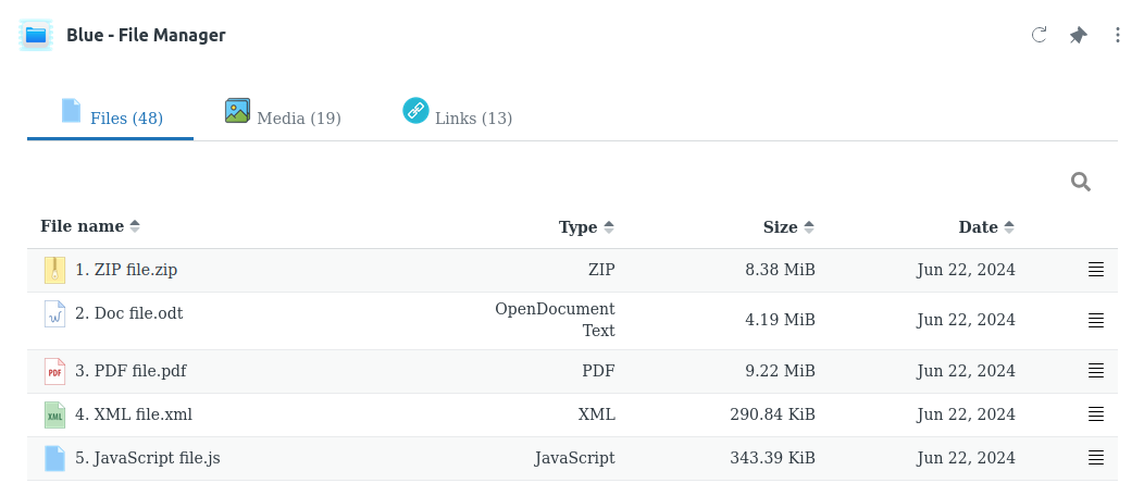 - Sort files by name, size, date.