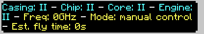 This piece shows the parts the drone is made up of, the frequency of the drone (only changeable through the Drone flyer), the drone's current flying mode (manual control, or follow player, or off,...), and the Estimated Fly Time (EFT).