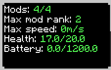 - Max speed: 0m/s - the maximum speed the drone can reach, displays as 0 if not flying, and if you lower the engine level, this will decrease also.