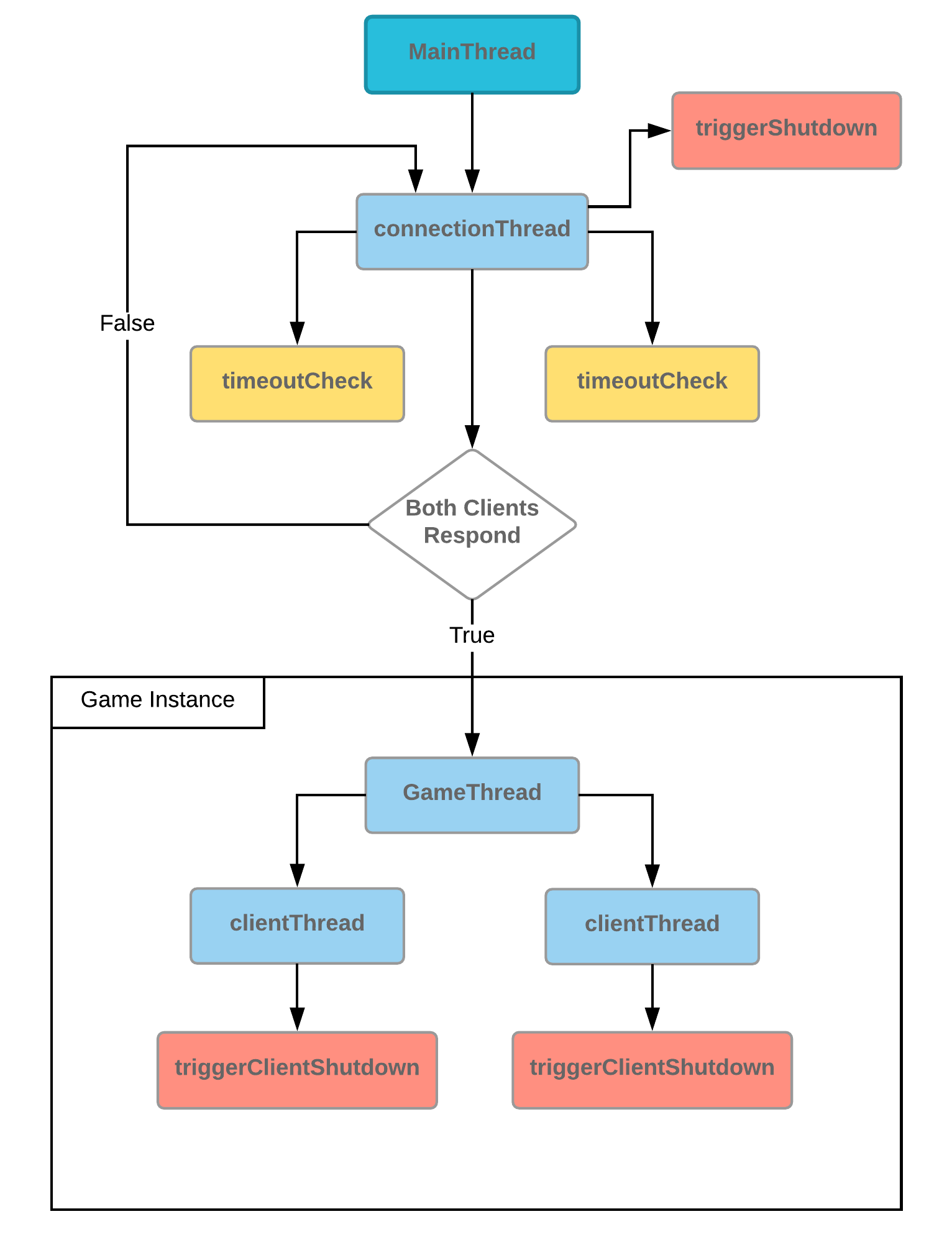 }After the server verifies both client’s heartbeats, it spawns a GameThread to handle communication with the two clients. To facilitate communication with both clients, the GameThread spawns two clientThreads to read from each of the client sockets and each clientThread spawns a triggerClientShutdown thread to respond to the kill trigger from the GameThread.