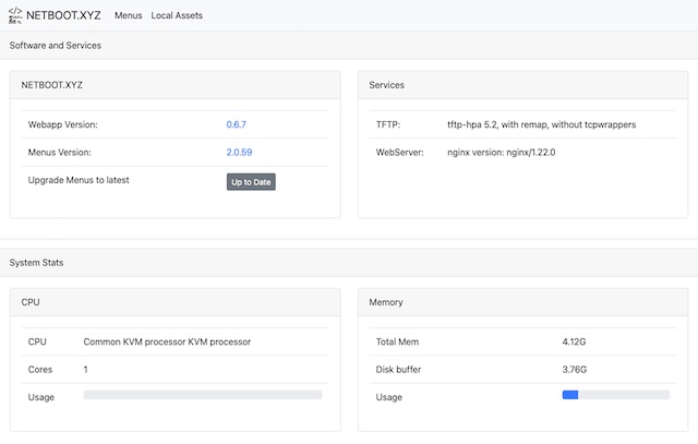 The netboot.xyz docker image allows you to easily set up a local instance of netboot.xyz. The container is a small helper application written in node.js. It provides a simple web interface for editing menus on the fly, retrieving the latest menu release of netboot.xyz, and enables mirroring the downloadable assets from Github to your location machine for faster booting of assets.