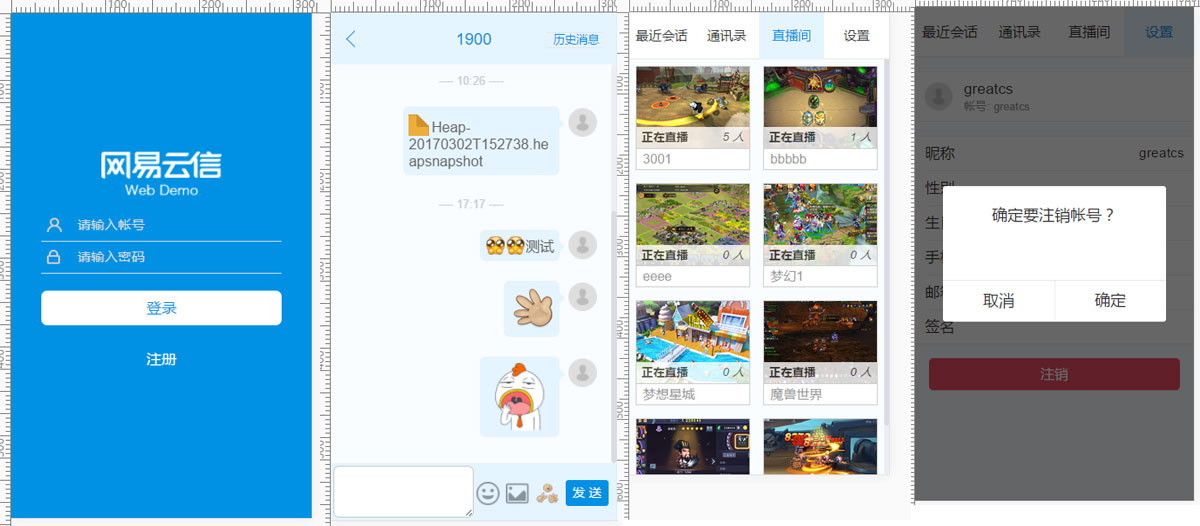 云信WEB DEMO HTML5-VUE版本 (以下简称h5 demo),是一套使用网易云信WEB端SDK,以VUE前端框架作为前端UI及缓存数据框架,进行开发的手机移动端适配DEMO。 h5 demo的推出,使得云信SDK的开发者们可以更便捷的利用移动端渠道推广他们的即时通讯产品(如微信、手机微博、手机浏览器等),或通过WebView嵌入到嵌入式设备中,作为混合APP进行发布。