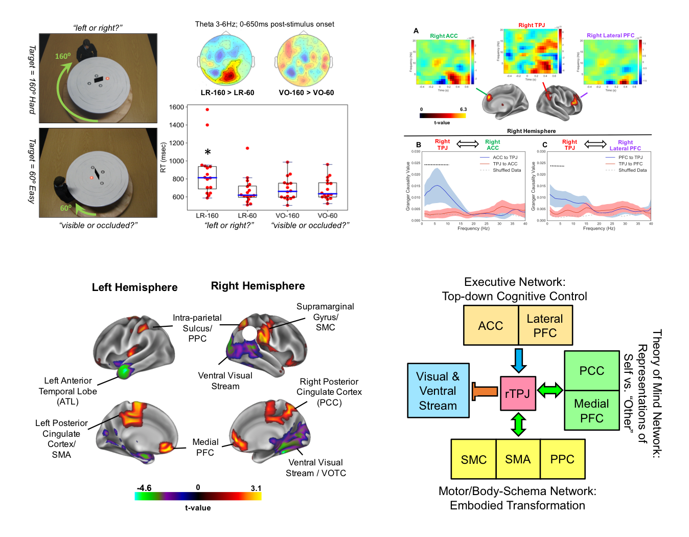Mentally imagining another’s perspective is a high-level social process, reliant on manipulating internal representations of the self in an embodied manner. Recently Wang et al., (1) showed that theta-band (3-7Hz) brain oscillations within the right temporo-parietal junction (rTPJ) and brain regions coding for motor/body schema contribute to the process of perspective-taking. Using a task requiring participants to engage in embodied perspective-taking, we set out to unravel the extended functional brain network and its connections in detail. We found that increasing the angle of disparity between self and other perspective was accompanied by longer reaction times and increases in theta power within rTPJ, right lateral pre-frontal cortex (PFC) and right anterior cingulate cortex (ACC). Using nonparametric Granger-causality, we showed that during later stages of perspective-taking, the lateral PFC and ACC exert top-down influences over rTPJ, indicative of executive control processes required for managing conflicts between self and other perspectives. Finally, we quantified patterns of whole-brain phase coupling (imaginary coherence) in relation to rTPJ during high-level perspective taking. Results suggest that rTPJ increases its theta-band phase synchrony with brain regions involved in mentalizing and regions coding for motor/body schema; whilst decreasing its synchrony to visual regions. Implications for neurocognitive models are discussed, and it is proposed that rTPJ acts as a ‘hub’ to route bottom-up visual information to internal representations of the self during perspective-taking, co-ordinated by theta-band oscillations. The self is then projected onto the other’s perspective via embodied motor/body schema transformations, regulated by top-down cingulo-frontal activity.