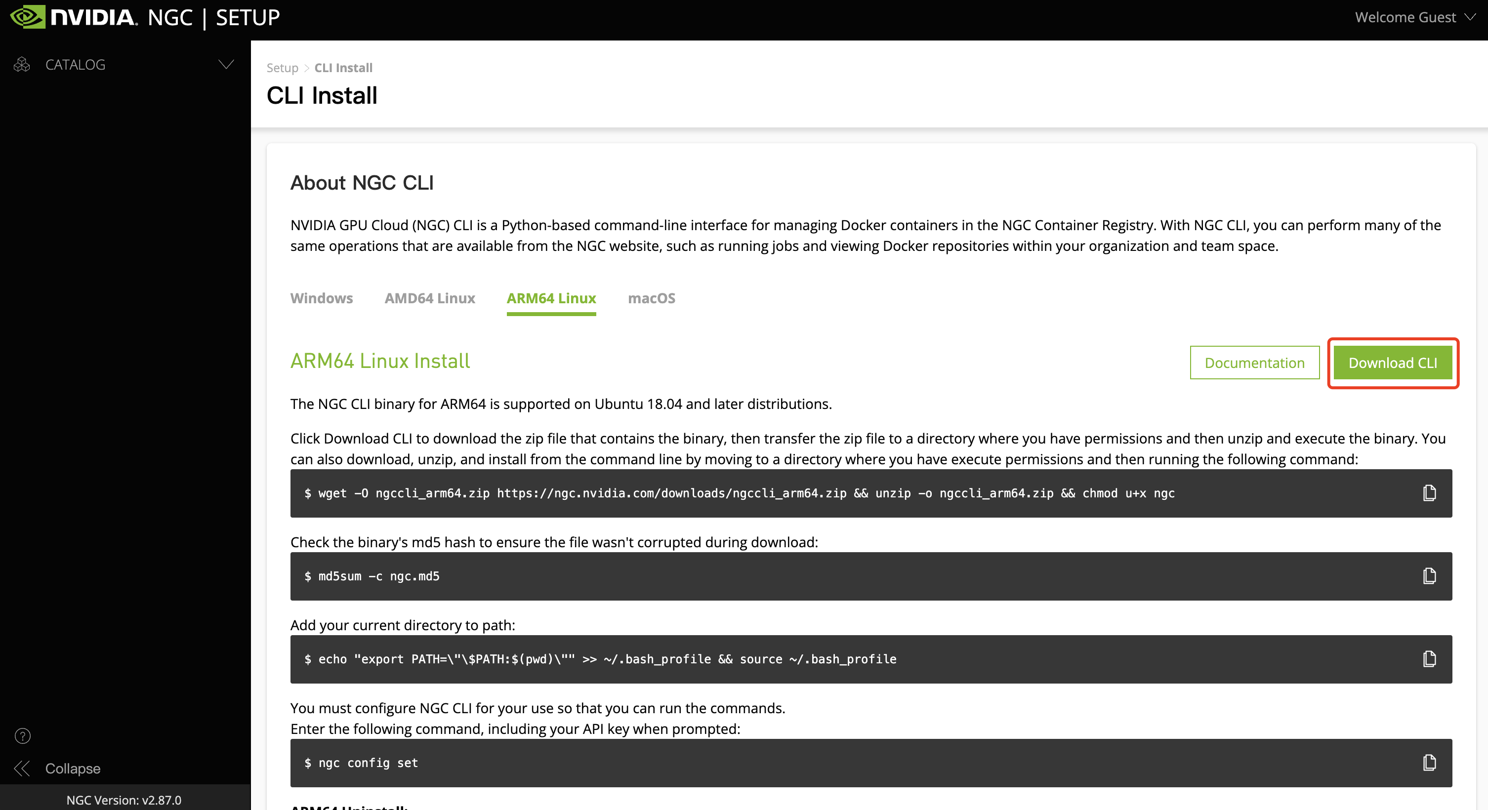 wget -O ngccli_arm64.zip https://ngc.nvidia.com/downloads/ngccli_arm64.zip && unzip -o ngccli_arm64.zip && chmod u+x ngcCheck the binary's md5 hash to ensure the file wasn't corrupted during download: