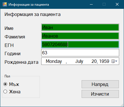 If the EGN is correctly set, mark one of the two radio buttons (radioButton1 or radioButton2). Taking into account the ninth character in the EGN string, and with an even value, the marker falls on radioButton1, and with an odd value, on radioButton2. 3. With correctly set input data, an appropriate message should be displayed and after it a third Form3 (Vaccines) should be launched. Add the controls to it: