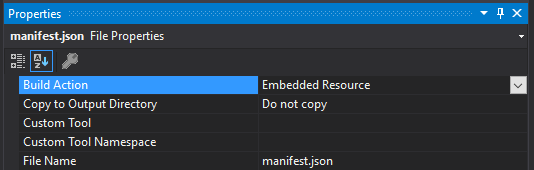 manifest.jsonin the same namespace as the main class. To embed a file in the assembly correctly, selectBuild Action->Embedded Resourcein the file properties in Visual Studio.