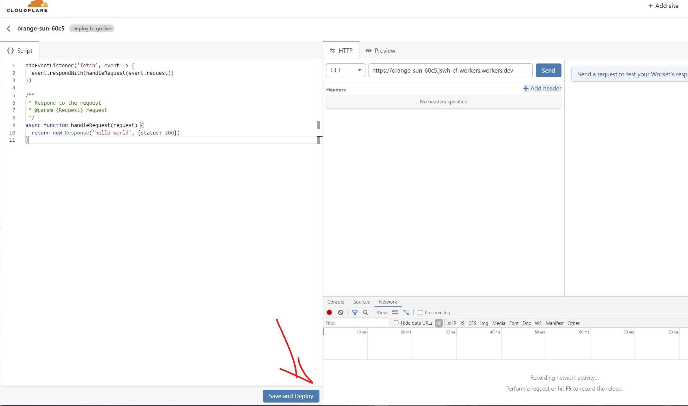- 在左侧编辑框中黏贴代理代码.代码在cf-worker.js.然后点击save and deploy