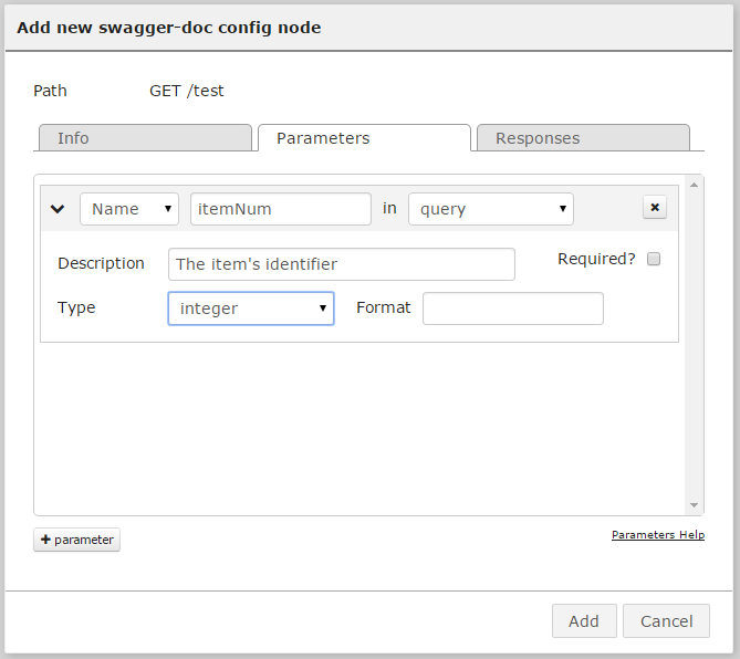 - Type - The type of the parameter. Since the parameter is not located at the request body, it is limited to simple types (that is, not an object).