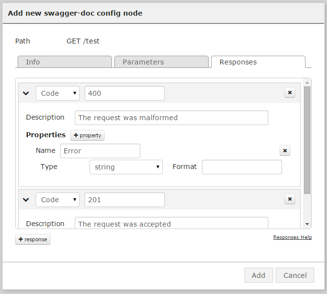 - Code - You can either select to define the default response, or to provide a specific HTTP status code that the response will be applicable for. A default response is used to cover other undeclared responses