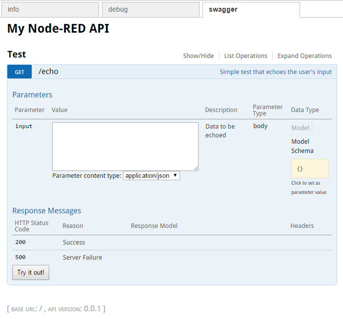 Swagger-UI is including in the plugin. Once loaded, the plugin will show a swagger tab in the node-red sidebar. From here, you can see the dynamically generated swagger for the current flow. Additionally, you can use the test function to try out your API directly from the editor, providing any parameters you have defined in the docs for the HTTP-In nodes. The Swagger-UI will automatically refresh any time the flow is redeployed.